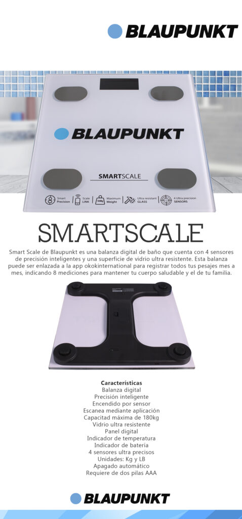 Smart Scale de Blaupunkt es una balanza digital de baño que cuenta con 4 sensores de precisión inteligentes y una superficie de vidrio ultra resistente. Esta balanza puede ser enlazada a la app okokinternational para registrar todos tus pesajes mes a mes, indicando 8 mediciones para mantener tu cuerpo saludable y el de tu familia.
