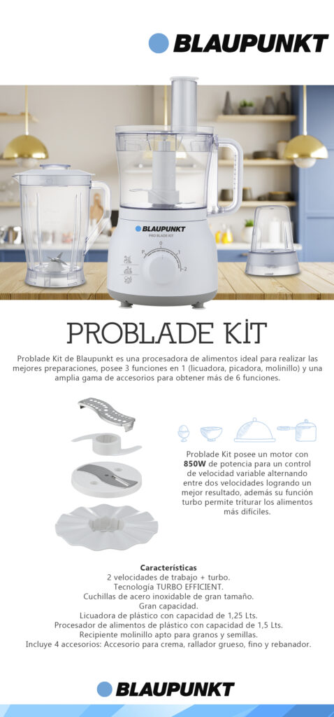 Problade Kit de Blaupunkt es una procesadora ideal para realizar las mejores preparaciones, ya que, posee 3 funciones en 1 (licuadora, procesadora de alimentos y molinillo) y una amplia gama de accesorios para obtener más de 6 funciones. Realiza tus recetas en el menor tiempo y con un mínimo esfuerzo, sus cuchillas de acero inoxidable de gran tamaño permiten un mejor triturado.