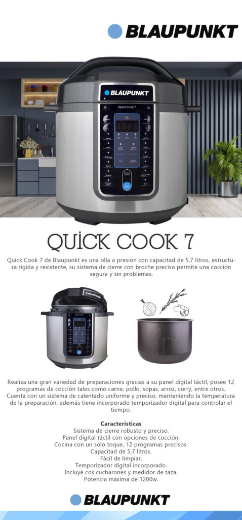 Quick Cook 7 de Blaupunkt es una olla a presión con capacitad de 5,7 litros, estructura rígida y resistente, su sistema de cierre con broche preciso permite una cocción segura y sin problemas.